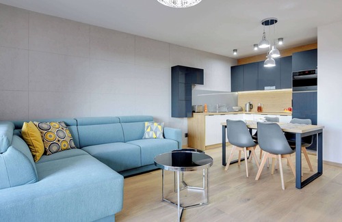 This unique apartment combines style, comfort and functionality. The space has been designed with attention to detail, providing a comfortable place to relax and unwind. The spacious living room is equipped with a sofa bed, a stylish coffee table and a table with chairs, ideal for both dining and working. Large windows let in plenty of natural light, creating a pleasant and bright atmosphere. The kitchenette is a fully equipped space, containing a modern induction hob, fridge with freezer, dishwasher and electric kettle. There is also full tableware, allowing you to prepare and eat meals. The separate bedroom offers a comfortable double bed, ideal for regenerating after an intense day. The modern bathroom is equipped with a shower, toilet and a cabinet with a washbasin. It has been finished in an elegant style, ensuring comfort and aesthetics. Guests have at their disposal a TV with cable TV and fast Wi-Fi, which provide entertainment and the possibility of working. The apartment is located in a modern building with access to amenities such as a sauna, swimming pool and gym, which makes your stay even more comfortable and relaxing.