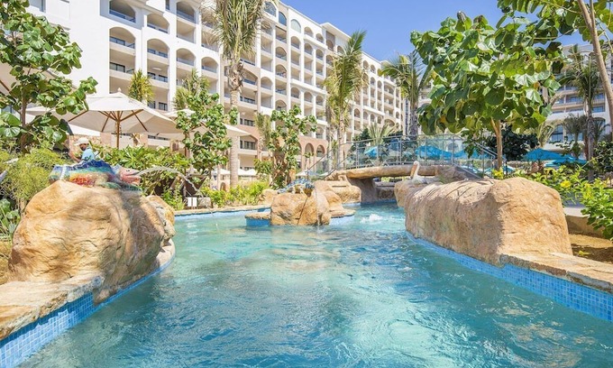 The five restaurants offer excellent menus, including vegetarian options. The lazy river weaves by the three pools, and floats are provided. Carry your drink with you on the river!