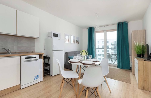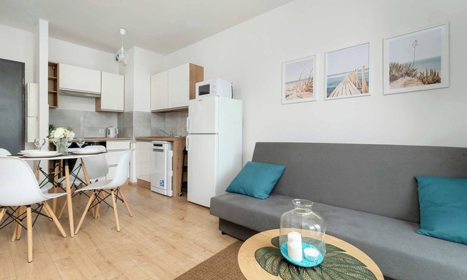This functional and modernly decorated 29 sqm apartment in Gdynia is a great place for parents traveling with their kids or a group of friends, able to comfortably accommodate up to four people. The bright interiors, maintained in a minimalist but cozy style, create an atmosphere conducive to relaxation and joyful moments together. The living room has a double sofa bed (120x190 cm), which will provide a comfortable place to sleep. A 32-inch Smart TV with access to cable channels is available for evening movie screenings. From the room you can go out to a charming balcony equipped with garden furniture, which is a great place for morning coffee in the sunshine or evening relaxation overlooking the countryside. The kitchenette has been carefully designed to meet the expectations of even the most demanding cooking enthusiasts. There is a refrigerator with freezer, oven, electric hob, microwave and electric kettle. The dining table encourages communal meals and long conversations. The bedroom is a real oasis of tranquility, dominated by a double bed of 140 cm, which guarantees a peaceful sleep. The capacious closet easily accommodates all your luggage. In the elegant bathroom stands a bathtub ideal for a relaxing bath after a busy day. A washing machine and hair dryer are also available, which will surely be appreciated by those planning a longer stay. An additional advantage is an outdoor gym and a play space for children. There are also bicycle racks by the building, which encourages active spending of time.