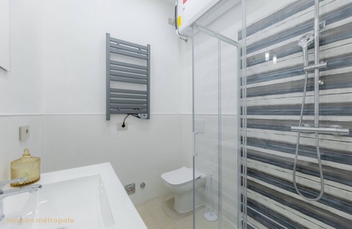 The dining table is the perfect space to share a meal or work comfortably on your laptop. The bathroom is equipped with a washing machine, shower, toilet and bidet, and provided with a set of towels and a shampoo & shower gel kit.