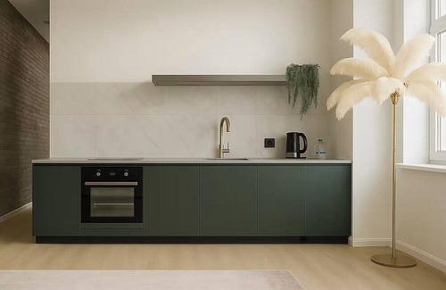 Cook like at home with a sleek, minimalist kitchen featuring modern appliances, a dishwasher, cooking essentials, and a coffee machine.