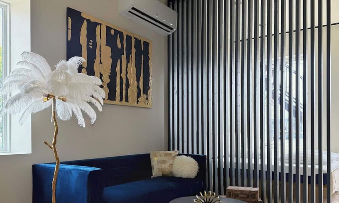 Relax on a bold velvet sofa in a thoughtfully designed space with floor-to-ceiling slat dividers, curated artwork, and natural light streaming through the large windows.