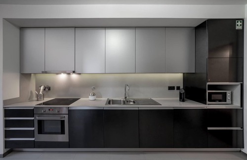 Modern-style apartment with minimalist decor throughout. This accommodation, located on the 2nd floor of a recently-built, ultra-modern building, has two bedrooms with double beds, a balcony, a dressing room and two bathrooms, one of which is a private bathroom with a bathtub and the other a shared bathroom with a shower.