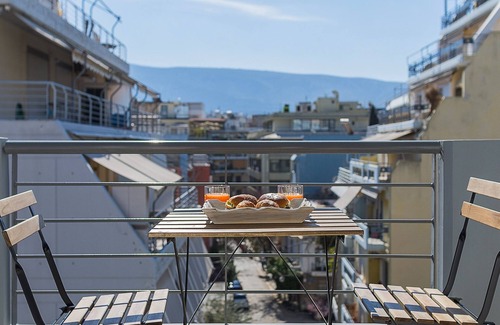 A small table doubles as a desk for those needing to catch up on work or a cozy spot for two to enjoy a delicious meal. Step out onto the delightful balcony, your personal oasis where you can sip your morning coffee while basking in the warm Athenian sunshine.