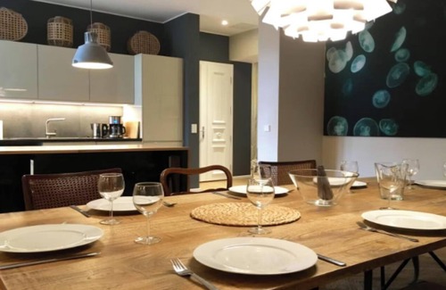 This light-filled apartment features five individually closable bedrooms, each with real beds to comfortably sleep up to 10 guests. Whether you’re traveling with friends, colleagues, or extended family, everyone will have their own space to relax and recharge. With three modern bathrooms, each fitted with walk-in showers and located adjacent to the bedrooms, mornings and evenings remain smooth and hassle-free—even with a large group.