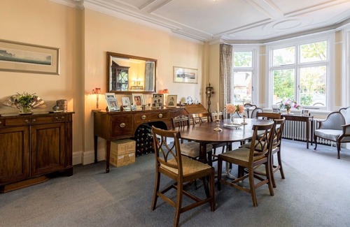 The dining room is spacious, with views to the street from the bay window. In the centre of the space, is a long wooden dining table and surrounding chairs. The room is decorated with paintings and mirrors.