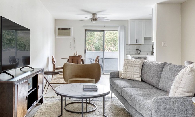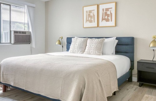 This furnished apartment is located in Valley Village, a sought-after neighborhood in Los Angeles's San Fernando Valley. Bordering North Hollywood, the area is home to walkable shopping, dining, and entertainment. It's easy to buy groceries and cook for yourself or head to neighborhood spots like Marie et Cie or Rustic Spoon for a delicious meal. Another neighborhood gem is Valley Village Park, a pocket-sized green space with a playground, a picnic area, and sports fields. Although Valley Village is walkable, most residents rely on cars to get around.