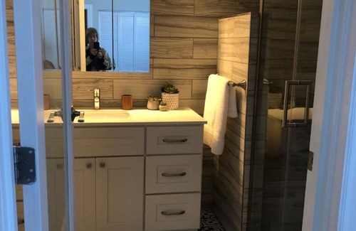 The master bedroom has a queen size bed with luxury mattress and a nice-sized closet. The master bathroom is beautiful with gorgeous tile and a new shower with bench.