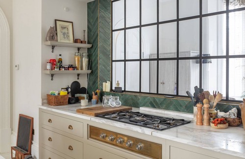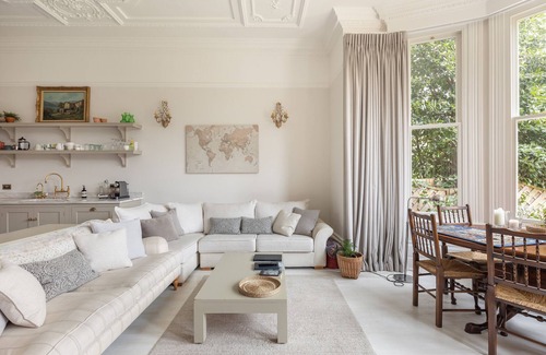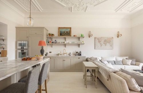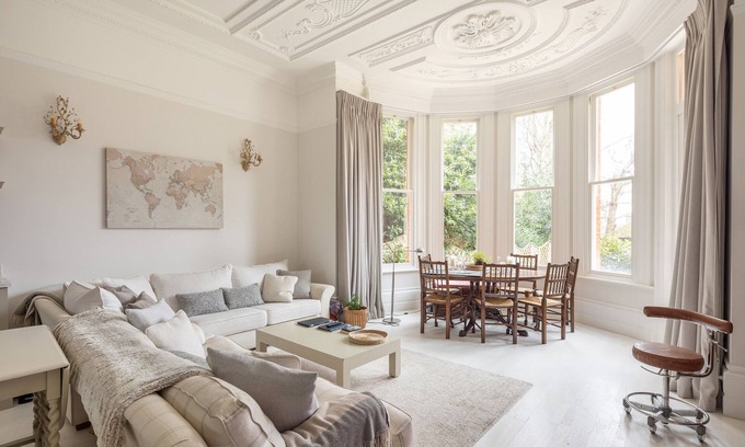 Ornate ceilings, a characterful fireplace and a majestic bay window bring a grandiose feel to the open-plan living and dining area. Peaceful in its gentle cream and white palette, this refined space is equipped with two plush sofas and a spacious dining table presenting views out across the garden terrace. A glossy marble island takes centre stage in the chic modern kitchen, fully equipped with all key amenities and embellished by Crittall windows that skilfully tease in natural light.
