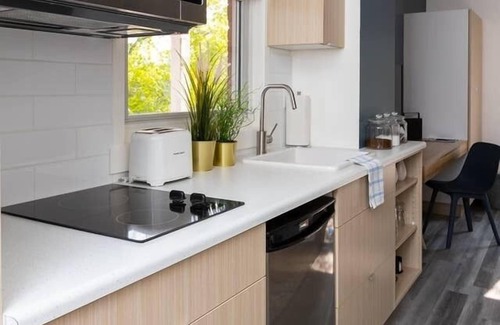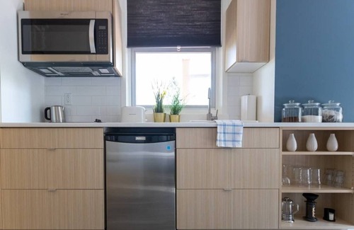 Your full kitchen includes a cooktop, microwave, fridge and sink along with kitchenware, glasses, mugs, dishes and cutlery. We didn't skimp on quality, and a selection of fine spices, herbs and seasonings from The Silk Road Spice Merchant as well as high quality olive oil supplied by Evoolution are available for use during your stay. Complimentary tea and fresh locally-roasted Transcend Coffee are also waiting for you!