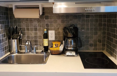 Glass top mini stove, fully equipped kitchenette, dining table by the window, plush soft queen bed and a sofa bed for your warm comfort. Our space is perfect for couples, adventurers, solo, business, small family or group of friends!