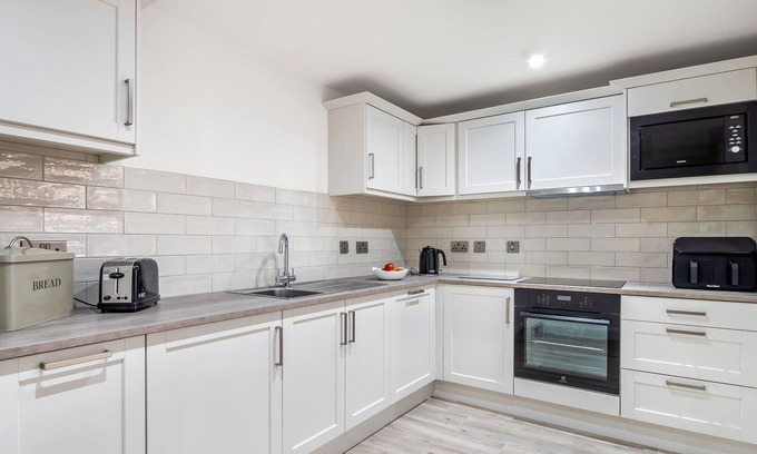 Open plan seating area with a leather couch, dining table seating up to 4 guests, fully fitted kitchen with all modern appliances including an air fryer.