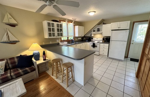 Walk up one flight of stairs to enter space. Very efficient full size, well outfitted kitchen, living room with TV, Bedroom with TV and full bathroom. Screened-in porch is the perfect space to start or end your day!