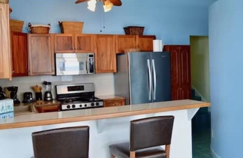 After a long day exploring the island, come home and unwind under the outdoor shower inside a natural cliff. The shared full bathroom also includes a unique sunk in bathtub to unwind and relax in.