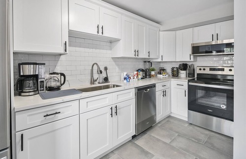 As you enter the front door, you`ll find yourself in a stylish living room with soothing neutral furnishings and coordinating decor. Two dove-gray sofas face each other, forming a lovely conversation area, while the WiFi-enabled smart TV allows you to stream everyone`s favorite shows and movies in comfort and camaraderie.