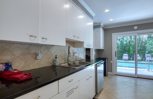 The fully stocked kitchen is between the Dining Room and the Family Room. There is absolutely everything you would need to cook in this house along with a Keurig, a Mr. Coffee coffee, and a tea kettle to get you started in the morning. The sink and ice maker have filters so no need to run out and buy bottled water or ice and there is a Brita pitcher in the refrigerator. We also have a mini-fridge that will hold all your cans and bottle so that leaves plenty of room for just food in the main refrigerator. The pool is just outside of the Kitchen via sliding doors.