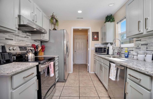 Fully Equipped Kitchen: Our kitchen is stocked with everything you need to prepare meals, including pots, pans, dishes, silverware, linens, a coffee pot, toaster, and serving accessories.