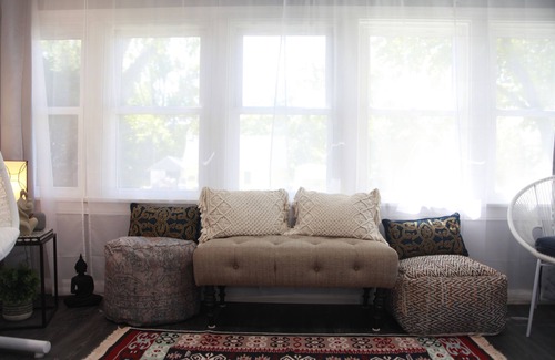 Place has a beautiful sunroom, where you can enjoy a quiet neighborhood and read a book on the swing chair.