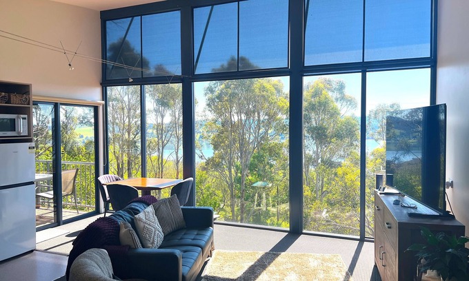 Apartment 9/1a Waldhorn Drive is a modern, comfortable apartment located at the renowned Tamar Ridge Vineyards in the heart of the Tamar Wine route, only 20 minutes from Launceston. Nestled amongst the treetops, the architecturally designed apartment with floor-to-ceiling windows provides spectacular views of the Tamar River, including gorgeous sunrises and sunsets. Fully self-contained and private, it is the ideal getaway for couples who love to relax in a peaceful, natural setting that is still only a short distance from a range of tourist locations, dining and shopping facilities.