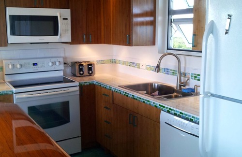 Cloudbreak Is Not Only A Place Of Island Tranquility. It is well equipped and maintained. We have two kitchens, that have modern appliances, quality cookware and ample dishes. We have two sets of full size washers and dryers to help you clean up after your long day at the beach. Our AC units are Mitsubishi Slims. They are the best you can buy when it comes to mini splits and are professionally maintained. Our home is a safe sanctuary. Our hurricane/security doors and windows turn our home into a fortified castle. With all of our windows and doors you always have a view and a breeze. We have furnished Cloudbreak to be beautiful but functional as a beach house to enjoy. So bring on the sand, the fun and know you will have an awesome good time. Oh did I mention that we have really hot water. We love good plumbing. Our living areas are great for lounging and family time. The bedroom upstairs has a queen bed, french doors and is romantic. The upstairs also has a queen futon with spring mattress in the open living room. The downstairs studio is a cool retro surf theme and has queen bed and queen futon. This makes plenty of room for a family or a great place for a couple renting either the upstairs or downstairs. There is nothing better than ushering in the sunrise from our front porch with your favorite java and toasting the sunset from the back porch after a day of surfing, fishing, or exploring.