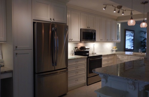 Well appointed and spacious Custom kitchen with gorgeous peninsula and a breakfast bar. Whether you choose to prepare a meal from scratch or just mix up some cocktails, you will find everything you need. The kitchen features full sized refrigerator with icemaker, Range with self-cleaning convection oven, Dishwasher. Lots of glasses, cups, plates and silverware. We offer crystal glasses and a variety of others for all of your favourite cocktails. We even have a fully stocked spice drawer.