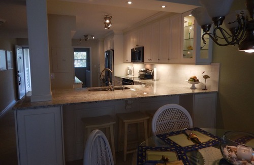 Microwave, coffeemaker, toaster. The large open breakfast bar allows the “cook” to enjoy the guests in the living room and the water view. It is perfect for casual dining or for guests to join you while you mix them a drink.