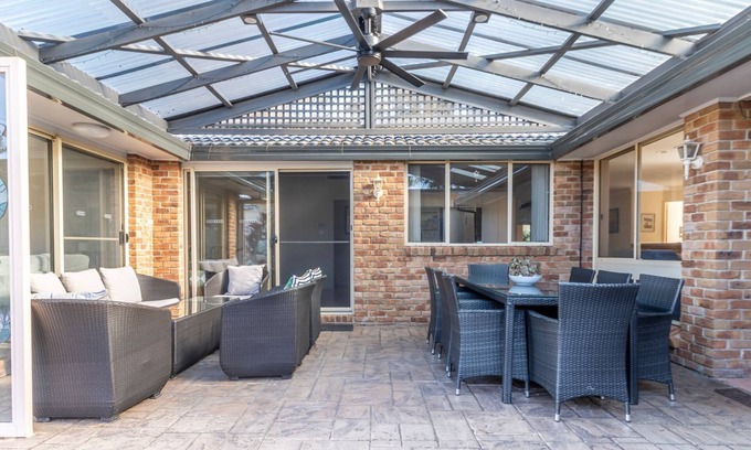 As you arrive at Berrara Breeze, you'll enter through the side gate, where you're greeted by a welcoming patio furnished with an outdoor lounge and dining table—an ideal spot to unwind after a day at the beach or out on the water. A large ceiling fan ensures comfort during warm summer days.