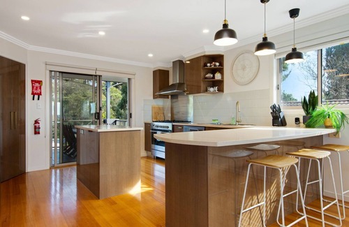 This elevated home boasts 4 well-appointed bedrooms, making it the ideal getaway for extended families or groups of up to 10 guests. Enjoy sunlit interiors, open-plan living, and a large, covered deck perfect for entertaining – all with stunning views over the bay.