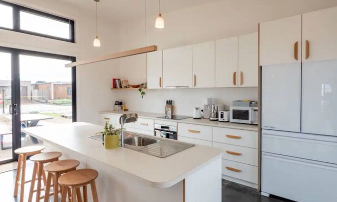 This new and modern property is located in beautiful Cape Paterson, in the award-winning eco village, The Cape. This holiday home is only a short 1.4km walk to the beach along the village paths. This well-insulated property features a fully equipped kitchen with electric cooking, a microwave, dishwasher, breakfast bench with seating and refrigerator, and high quality kitchen utensils.