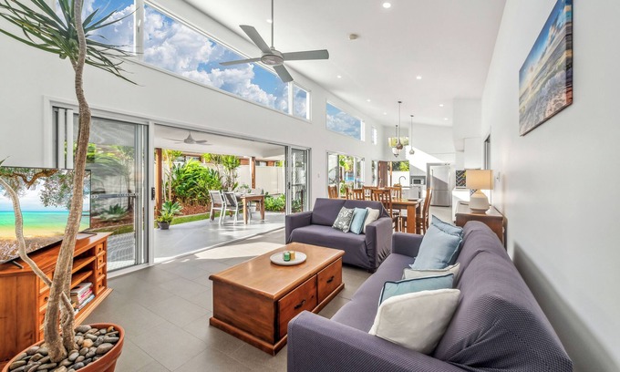 Coastal home located across the road from Wurtulla Beach, with sea breezes and soothing sounds of the surf. Perfect retreat for a beach holiday or work from home environment. Enjoy a day on the beach, surfing, swimming or follow the coastal pathway to restaurants, cafes and an ice cream shop. Only a short drive to Sunshine Coast Stadium, SCUH, Kawana Lake and the Birtinya shopping precinct. This modern home exudes natural light and high ceilings, which provides a feeling of spaciousness. Featuring a main bedroom with an ensuite & walk in robe and is separated from two further bedrooms. Bedroom 2 is furnished with a queen size bed, whilst bedroom 3 features a Long Single bed. Both bedrooms have built in robes & ceiling fans. A central bathroom and separate toilet service the 2 bedrooms. The light filled kitchen provides plenty of bench & storage space, including an electric oven and cooktop, Fridge/Freezer & dishwasher. Cooking utensils, pots, pans, glasses and crockery are all provided for the home cook (or walk down to Bocca Italian for delicious pizza & pasta). The main living room is comfortably furnished with a 6 person dining setting, alongside the sitting room with a 3 seater and 2 seater sofa and 48" TV. A separate multimedia room which can be partitioned off with sliding doors, contains a study/work desk, plus another 2 seater sofa. The main bathroom has a large shower & vanity unit, with a separate toilet & basin.