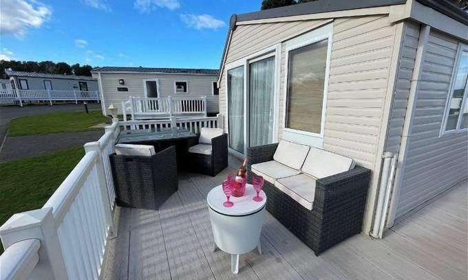The Caravan is situated on a quite area of the park (Pines, named after the pine trees which surround this area) with its own parking space and with patio doors leading onto the large wrap around veranda with plenty of seating which is ideal for dining alfresco and gets sun all day, weather permitting.