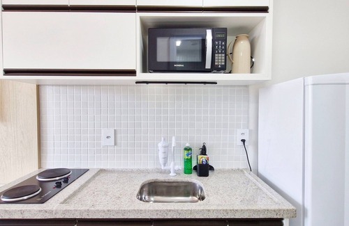 - Fully equipped kitchen with refrigerator, electric cooktop with 2 burners, water filter, counter with chair, electric coffee maker, microwave, sandwich maker, blender, thermos and basic kitchen items.
