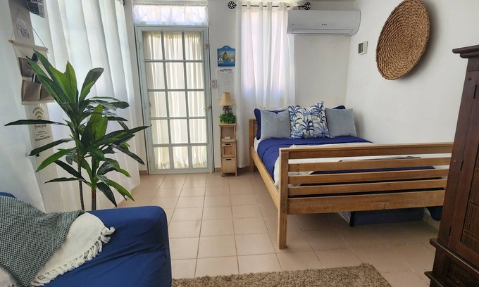Studio apartment with one full bed, refrigerator, microwave, coffee maker, toaster, eating area, includes continental breakfast, private bathroom, toilet paper, bath and hand soap, bedding, pillows, towels, Wi-Fi, television, air conditioning, solar panels, carbon monoxide and smoke alarms, fire extinguisher, first aid kit, emergency plan, open terrace, basketball and tennis courts, recreational park, parking, located in an exclusive place.