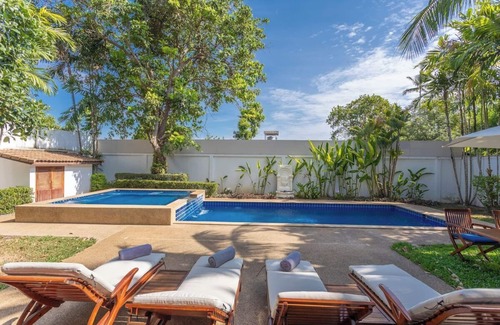 Escape to Coconut Palms Villa in Rawai, Phuket, for your luxurious stay. This spacious villa comfortably accommodates up to 8 guests with its 4 bedrooms and 3 bathrooms. Dive into your private pool with a jacuzzi, relax on your sun-drenched terrace, or enjoy the 85" TV and pool table. Located just minutes from Chalong Pier and beautiful beaches, you're close to markets, bars, and restaurants. The villa includes superfast WiFi, a fully equipped kitchen. Ideal for your family getaways. Book today.