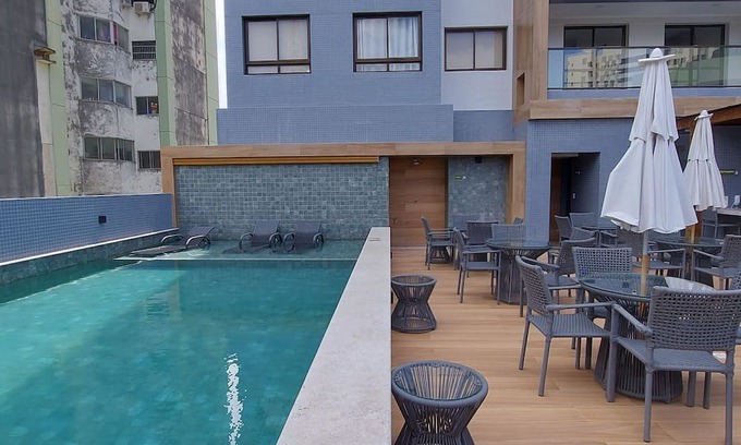 Beautiful, new, air-conditioned studio, very well located in Federação! It has a double bed, kitchen, split air conditioning, a smart TV with open channels, and WI-FI. The building has a swimming pool, coworking space, and a gym. 24-hour reception and 1 rotating parking space (you cannot park in spaces with exclusive signs). Laundry service with additional charge. Market across the street.