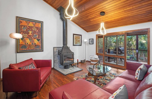 As you enter the front gate, you'll step into a fairy-tale garden. On this level you will enter the home and move from the entrance into an open plan kitchen, dining and living area which opens onto a deck overlooking the pool and tropical garden, with birdlife in abundance. On this level, there are three bedrooms, two with queen beds and one with a double bed, there are two bathrooms, with one being on-suite to the main bedroom. Each bedroom has a sliding door, opening onto a deck overlooking different parts of the garden. Two of the bedrooms upstairs share a bathroom.