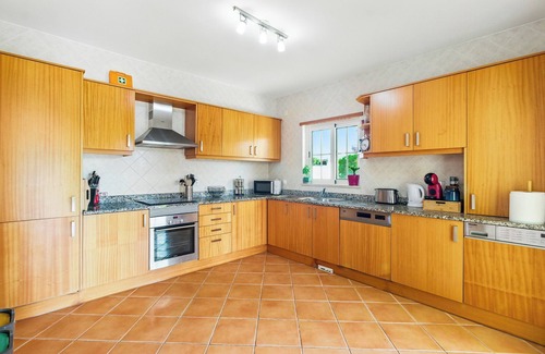 The fully equipped kitchen features sleek built-in appliances and opens onto a outdoor dining area complete with BBQ, ideal for al fresco meals.