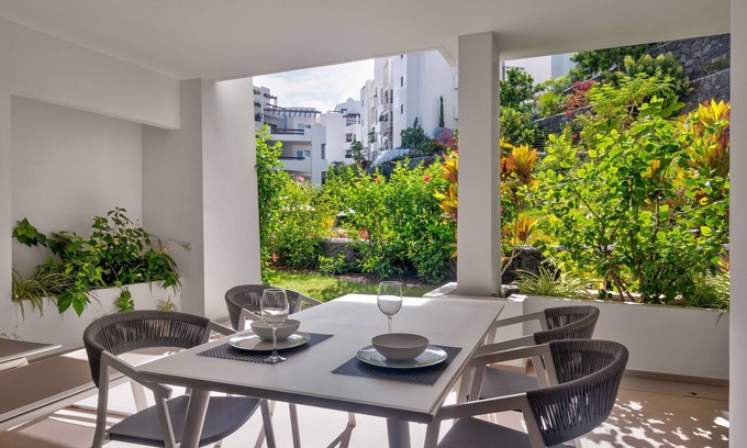 In "Colinas de los Menceyes" the entrance to Palm-Mar, you can enjoy subtropical gardens, waterfalls and two swimming pools, one of which and the children's pool are heated, a spacious solarium with sunbeds and parasols. "Colinas de los Menceyes" has a fully equipped gym with Technogym equipment. Only a ten-minute walk away you will find the shopping centre with a wide variety of gastronomic choices and the natural beach "la Arenita"