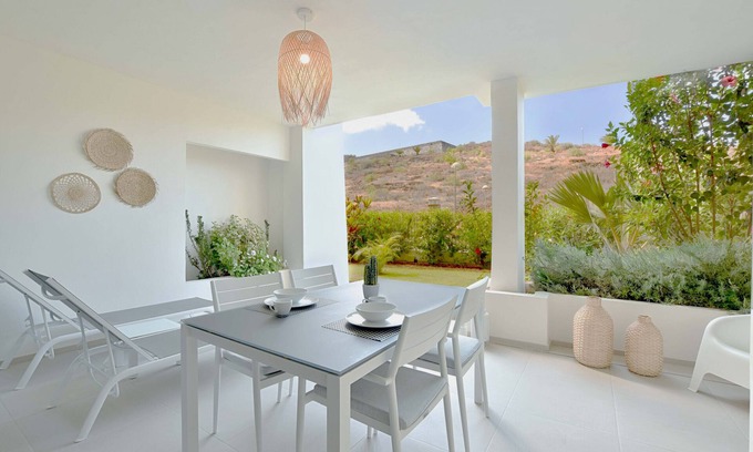 This tastefully furnished flat in Palm-Mar (Arona) has 1 bedroom and is fully equipped for 2 people.The accommodation has an area of 980 ft² , including the covered terrace views of the mountain and the garden.Palm-Mar, in southern Tenerife, is a small enclave, bordering the Atlantic Ocean and flanked by two nature reserves. It is a residential area just 15 minutes from "Tenerife Sur" airport .Los Cristianos and Las Americas are just a stone's throw away.A perfect base to explore Tenerife: magnificent nature, beaches, breathtaking landscapes, culture, colonial villages, unlimited sports activities... the best cocktail for an unforgettable holiday.Along the sun-drenched avenues flanked by exotic palm trees, you will find several restaurants, cafes, eateries, supermarkets, bank, pharmacy, medical centre, dentistbeauty centres, hairdressers, children's park and the beautiful Bahia Beach Club. Nearby, you can participate in various activities, such as golfing, hiking, cycling, snorkelling, etc.In "Colinas de los Menceyes" the entrance to Palm-Mar, you can enjoy subtropical gardens, waterfalls and two swimming pools, one of which and the children's pool are heated, a spacious solarium with sunbeds and parasols. "Colinas de los Menceyes" has a fully equipped gym with Technogym equipment. Only a ten-minute walk away you will find the shopping centre with a wide variety of gastronomic choices and the natural beach "la Arenita"To ensure security, the complex has been fully fenced with a controlled chip entrance. Each building has a maximum of 16 flats and has its own lift connected to the underground garage (subject to availability).This flat is equipped with iron, safe, free internet access (wifi), hairdryer, air conditioning, satellite TV (Languages: Spanish, English).The induction independent kitchen, is equipped with refrigerator, microwave, oven, freezer, washing machine, dryer, dishwasher, dishes/cutlery, kitchen utensils, Nespresso coffee machine, toaster, kettle, and juicer, ....