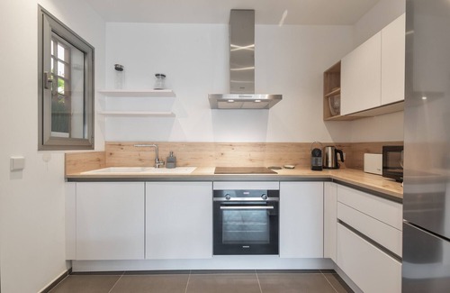 The induction independent kitchen,, with induction hob, is equipped with refrigerator, microwave, oven, freezer, washing machine, dishwasher, dishes/cutlery, kitchen utensils, Nespresso coffee machine, toaster, kettle, and juicer, ....