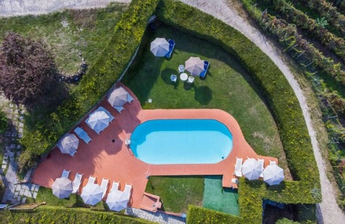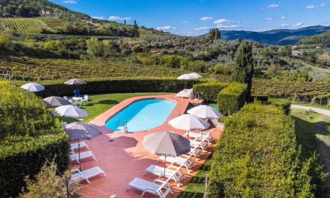 Large, rustic on a vinyard country house "Fattoria l'Ottavo", 400 m a.s.l from the 18th century, renovated, surrounded by meadows and vineyards. 3 houses in the residence. 9 apartments in the residence. In the district of Lucolena in Chianti 12 km from the centre of Greve in Chianti, 13 m from the centre of Figline Valdarno, in a secluded, sunny, elevated position, in the countryside. For shared use: property 40 ha, natural garden, meadow, swimming pool fenced (8 x 4 m, seasonal availability: 01.May. - 15.Oct. pool opening hours: 08:00-20:00). Outdoor shower, terrace, garden furniture, barbecue, pool maintenance by the owner/gardener. In the house: reception, restaurant, breakfast room, WiFi, washing machine (for shared use). Linen change weekly. Breakfast possible on request (extra). 200 m long narrow motor access to the grounds. Parking on the premises. Shop 700 m, grocery 700 m, supermarket 12 km, shopping centre 13 km, restaurant 1 km, bar 700 m, bakery 700 m, bicycle rental 12 km, bus stop "Lucolena" 700 m, railway station "Figline Valdarno" 13 km, sandy beach "Calambrone" 110 km, indoor swimming pool 13 km, lake Trasimeno 114 km. Golf course (18 hole) 20 km, tennis 12 km, riding stable 2 km, walking paths from the house 100 m. Nearby attractions: Firenze 37 km, Siena 50 km, Arezzo 54 km, San Gimignano 65 km. Please note: car recommended. Reception open 10:00-17:00 hrs. Suitable for families, baby equipment (included). Suitable for events. Local sale of farm products. Please note: the owner lives on the same property. All houses/apartments are individually designed/furnished.