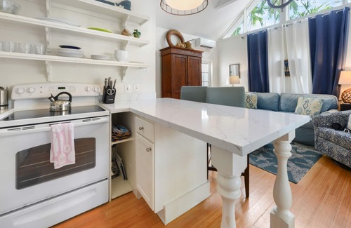 Located in The Colony, a secluded compound just steps from Duval Street, Colony Poolside is a peaceful retreat. Enter the home through the serene and inviting living space, accented with blue and white decor, wood floors and pops of color from nautical-themed accents and artwork. A vaulted ceiling with exposed beams and huge transom windows that extend all the way to the tip of the roof add a bright and airy feeling to the cozy space.