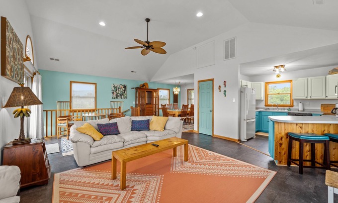 The home offers 3 bedrooms and 2.5 baths and can comfortably sleep 6 people. The bedrooms include 1 king, 1 queen, and 1 full size bed. The primary bedroom has a private bathroom while the queen and full bedroom share a Jack and Jill bathroom. There is also a half bathroom upstairs in the main living area. Bath towels and bed linens are included. There are smart tv’s in the king and queen bedrooms. Smart tv’s are also found in the den and the basement movie room. Internet is provided but guests will need to supply their own streaming services. The outdoor space includes a pool, picnic table, fire pit, charcoal grill, and outdoor shower. 4 beach chairs are provided so you don’t have to pack your own. You will also find the kitchen stocked with one roll of paper towels, 2 trash bags, two dishwasher pods, kitchen sponge, dish soap, hand soap, oils, and spices. Bathrooms have one hand towel, hand soap, and two roll of toilet paper. Please bring your own hygiene products. Shampoo and body wash not provided.