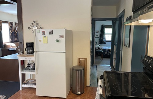 Outside in the very private backyard is a propane bbq, a dining table, and a staircase which leads to the Main Street. You’ll find a brewery/restaurant, pizza parlor, grocery store, library, and post office within a few minutes walk. The yard also has a clothesline to dry blankets and sleeping bags and is fenced to contain small and medium sized dogs inside. We are pet friendly and love dogs (and cats!).