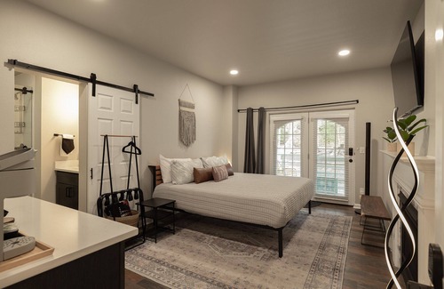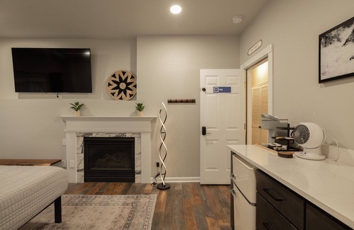 A perfect room for one or two guests. We love the fireplace, the private entrance and cozy, yet luxurious king bed. Room features a mini-fridge, coffee station, walk-in shower, debatably large TV for size of space and thoughtful touches throughout. For an additional fee, all rooms with private access are dog friendly. Up to 2 guests.