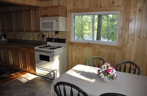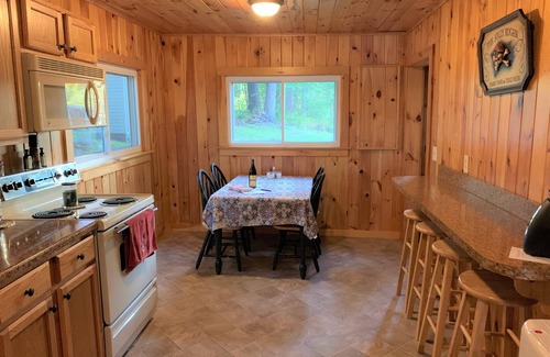 Comfort is the feeling you will experience with the beautiful tongue and groove knotty pine in each of the rooms that are appointed nicely with cozy furnishings. The cooks will love the spacious kitchen complete with sitting area and breakfast bar. You have great views of the water or surrounding woods from every window. There is a fully appointed kitchen with stove, oven, refrigerator/freezer with ice trays, dishwasher, microwave, coffee maker, toaster, popcorn popper, blender, pots, pans, dishes, complete utensils including vegetable peelers, wine opener, zester, garlic press, whisk, graters, measuring cups, can opener, etc.