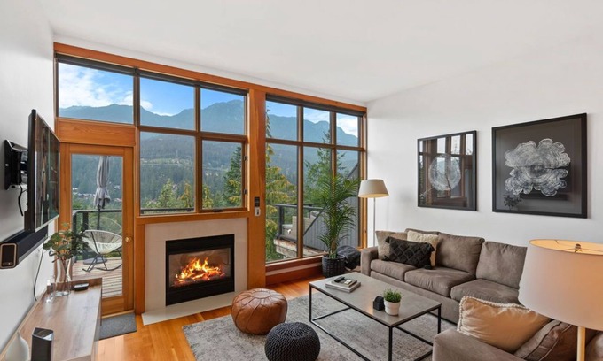 Spectacular views of Alpha Lake and the Tantalus Range, Indigenous Douglas Fir woodwork salvaged from the Stanley Park storm and open-tread stairs give this place it's name. Stylish, essential AC throughout, open concept living area, 3 spacious bedrooms, gas fire, 2 parking spots & tons of storage make this rare home the ideal place to adventure or unwind. The 6-minute stroll to the Creekside Gondola literally puts the mountains, forests and trails at your doorstep.
