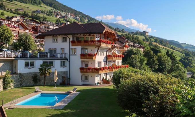 Aparthotel "Egger", 880 m a.s.l 4 storeys. 13 apartments in the residence. 100 m from the centre of Villanders/Villandro, 6 km from the centre of Klausen/Chiusa, 30 km from the centre of Bozen/Bolzano, on a slope. For shared use: property, beautiful, well-kept terraced garden (fenced) with lawn and trees, lawn for sunbathing, swimming pool (10 x 5 m, seasonal availability: 15.May. - 30.Sep.). Table tennis. In the complex: reception, bar, breakfast room, sauna (extra). Lift. Parking at the house on the premises, communal covered parking (extra). Supermarket 100 m, restaurant 500 m, bakery 100 m, bus stop "345 Klausen-Villanders-Vill.Alm" 50 m, railway station "Klausen/Chiusa" 8 km. Walking paths from the house 10 m, cycle lane 6 km. Nearby attractions: Brixen/Bressanone 17 km, Sterzing/Vipiteno 47 km, Ritten/Renòn 22 km, Lengmoos/Longomoso (earth pyramids) 17 km, Mountain-Biking 10 m. Well-known ski regions can easily be reached: St.Ulrich/Ortisei (Gröden/Val Gardena) 21 km, Seis/Siusi (Seiser Alm/Alpe di Siusi) 17 km, Plose 25 km. Hiking paths: Villanders/Villandro 10 m, Lajen/Laion (Grödner Tal/Val Gardena) 17 km, Seis/Siusi (Schlern/Sciliar) 17 km.