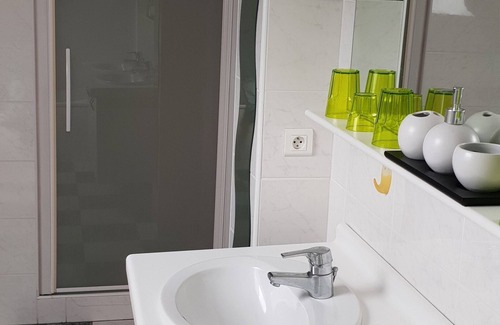 Two bedrooms with double beds, one bedroom with 3 single beds. A bathroom with shower and bath, two basins. A living room with two sofas, coffee table, TV TNT. An equipped kitchen with dining area.
