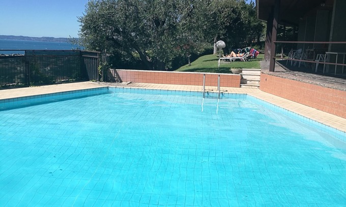Small apartment In Costermano just above Garda on Lake Garda, wonderful views of the Southern part of Lake Garda from the swimming pool garden area .